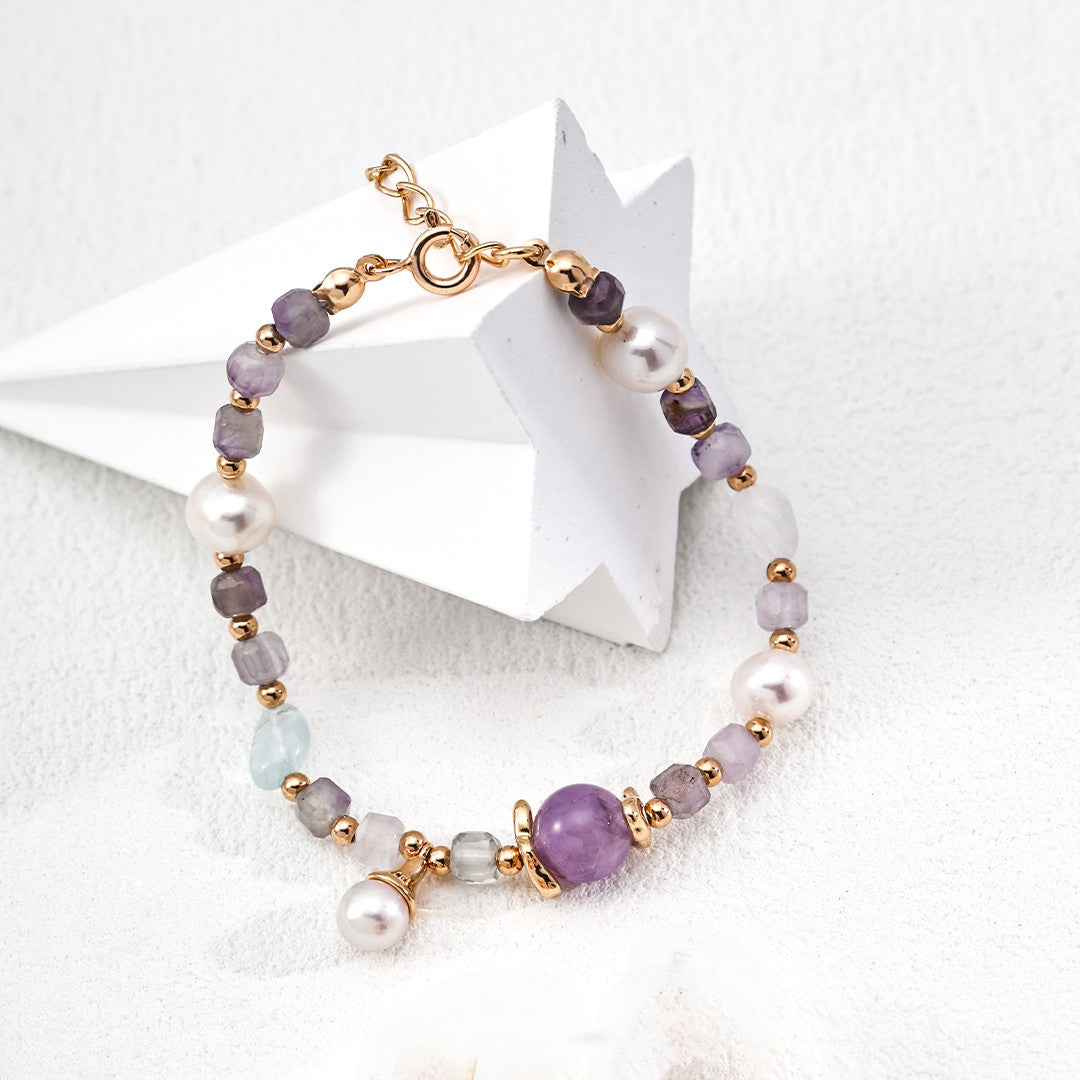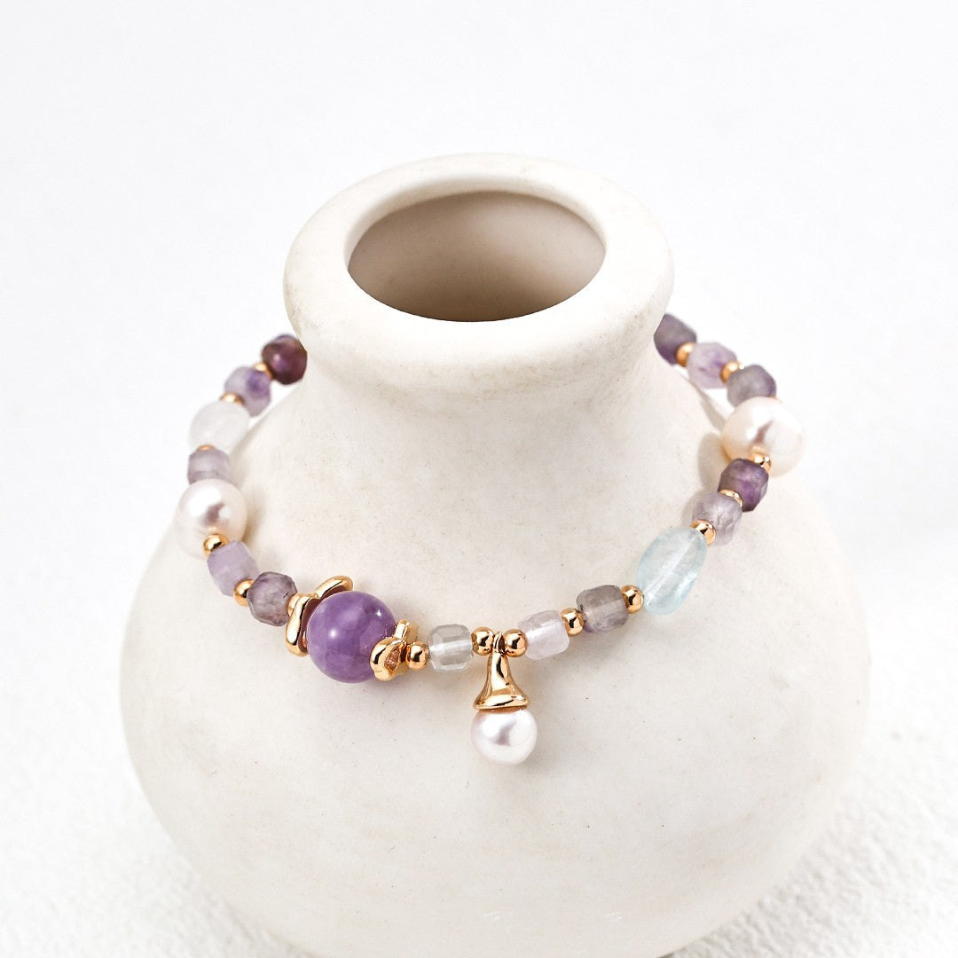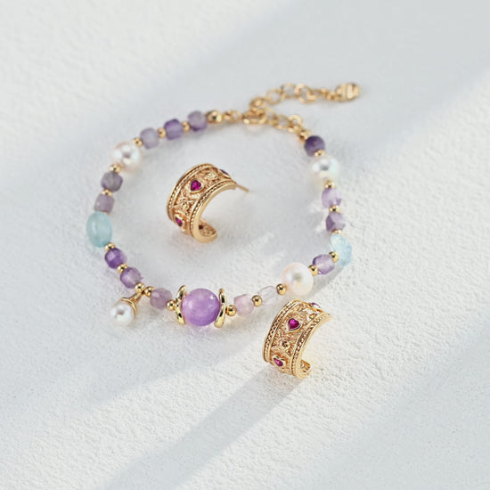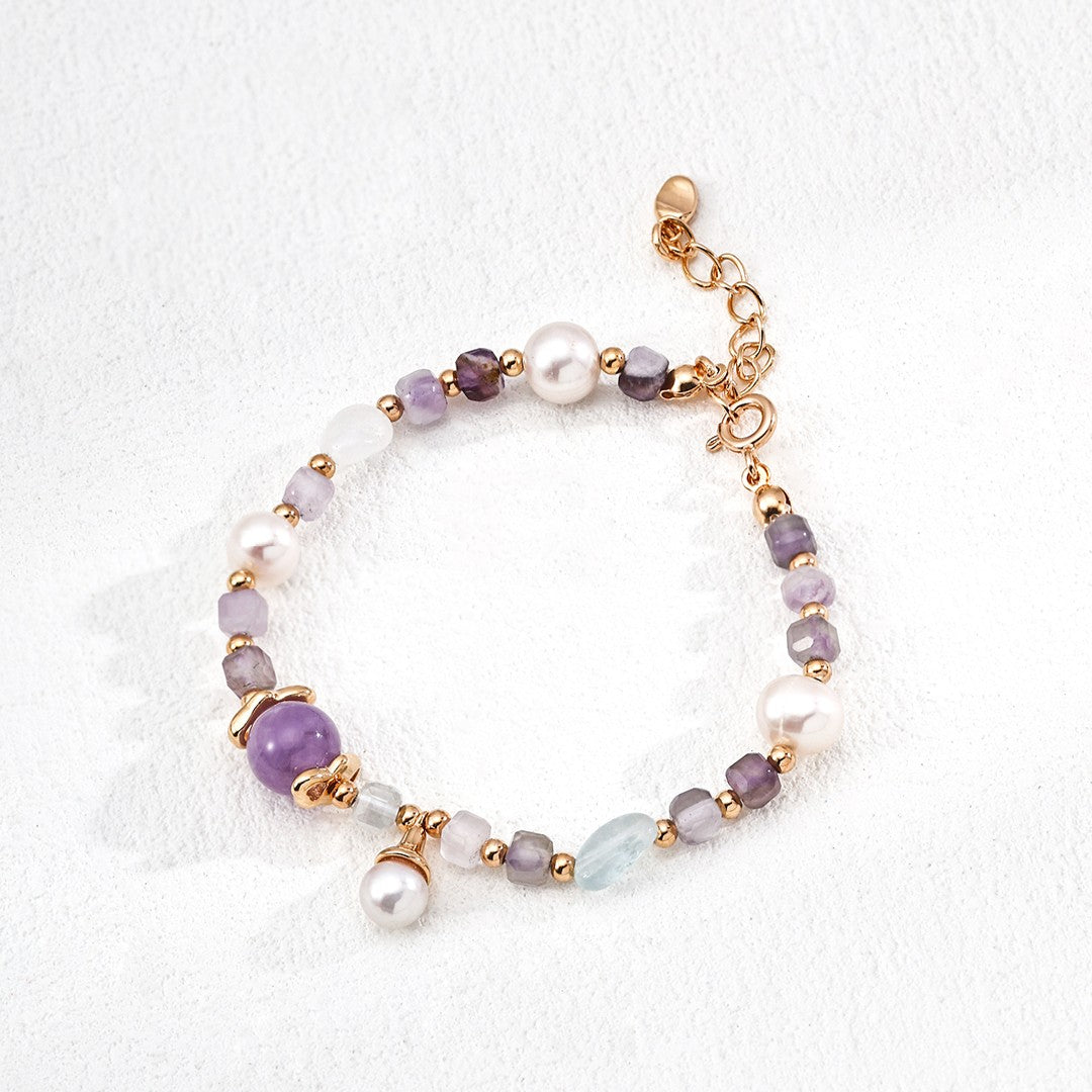 الأحجار الكريمة: اللؤلؤ (6 مم/7 مم)، الجمشت (8 مم/4 مم)، الأكوامارين